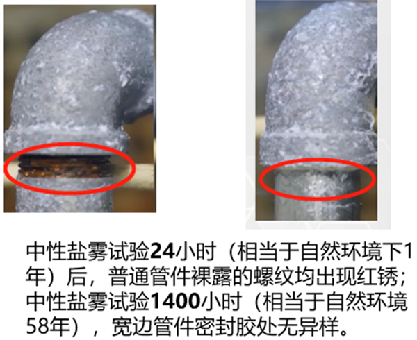 在嚴格的中性鹽霧試驗中,玫德寬邊瑪鋼燃氣管件表現驚人,歷經 1400 小時依然無銹蝕跡象。而普通瑪鋼管件在同樣試驗條件下,短短 24 小時便出現紅銹,二者防腐性能高下立判。這一卓越成績充分證明了玫德管件強大的抗腐蝕能力,即使在惡劣環境中,也能長期保持良好性能,大大延長了使用壽命。