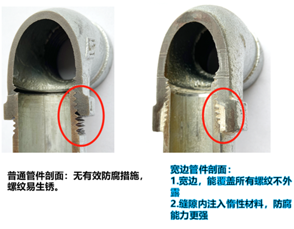 區別于傳統管件,玫德寬邊瑪鋼燃氣管件采用突破性的寬邊構造,能將所有螺紋緊密覆蓋,使其完全不外露。這一設計從根本上消除了因螺紋裸露,在長期使用過程中可能因磨損、松動而引發燃氣泄漏的風險。對比普通燃氣管件連接時,鋼管會有 2 - 3 扣螺紋暴露在外的情況,玫德管件的安全性得到了質的提升。
